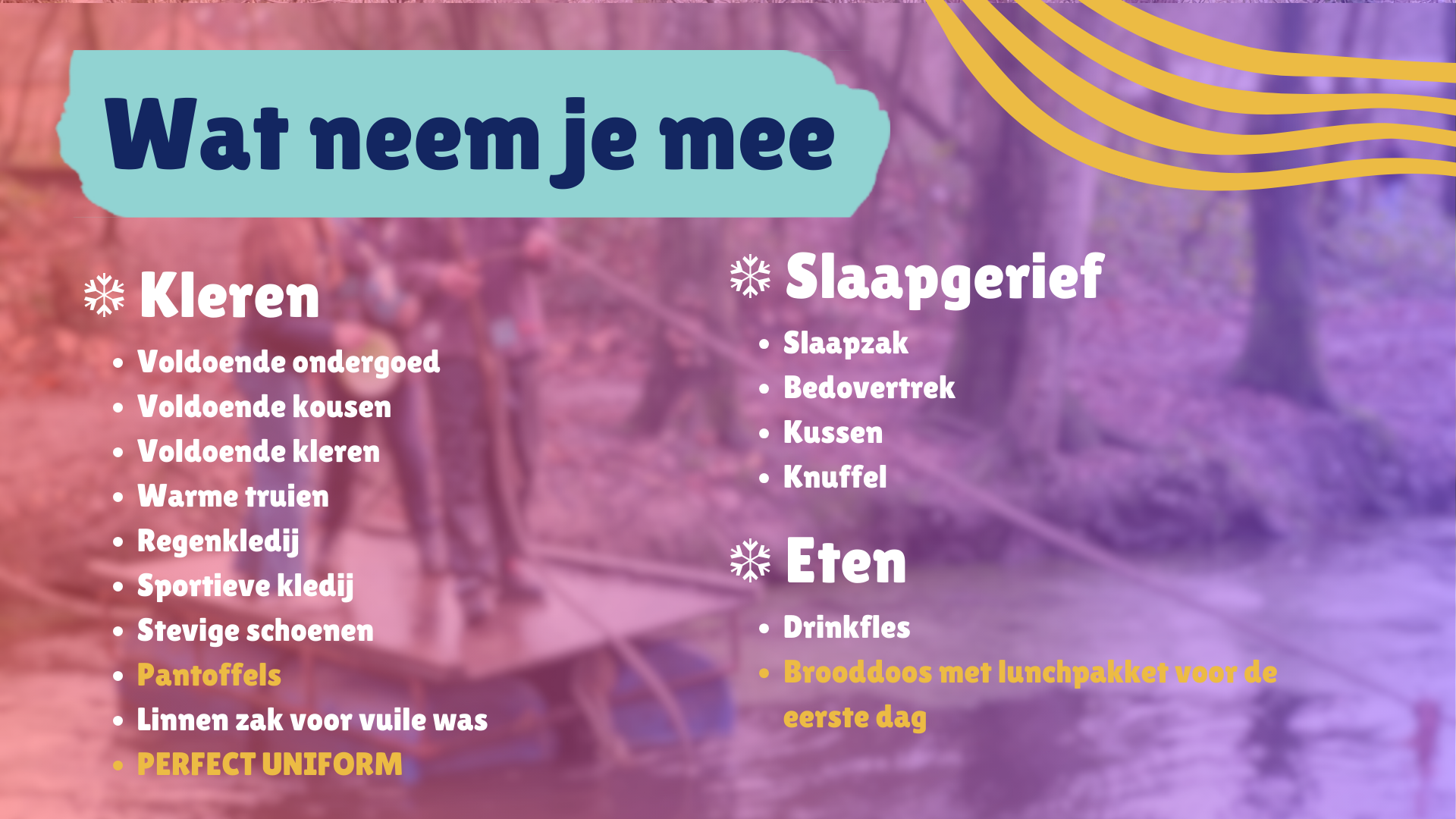 Vergeet zeker geen handschoenen mee te nemen, zonder handschoenen kan je niet meeschaatsen. Ook vragen we dat iedereen €5 meeneemt en dit afgeeft aan de leiding zodra je toekomt.