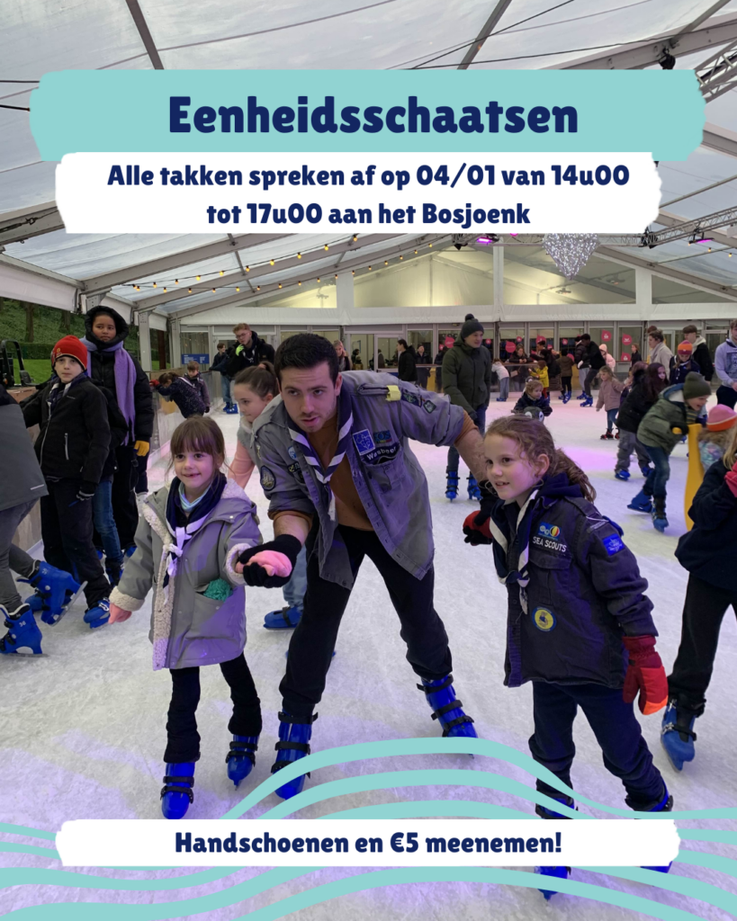 Deze zondag gaan we met de volledige eenheid het ijs op! Alle takken spreken af op zondag 4 januari om 14u00 aan het Bosjoenk. Vandaar vertrekken we naar de schaatspiste. De activiteit eindigt voor alle takken om 17u00 terug aan het Bosjoenk.